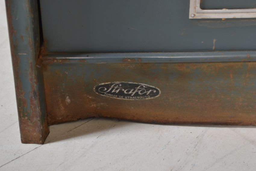 A pair of  large Industrial mid century 30 section fall front filing cabinet of metal construction having fall front individual sections with pull handles,3 rows of ten in upright formation