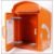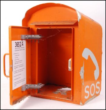 An original British 20th century industrial SOS motorway roadside empty tin phone box in a pastel orange with number to side ' 3652A ' and telephone symbols with door to the front.