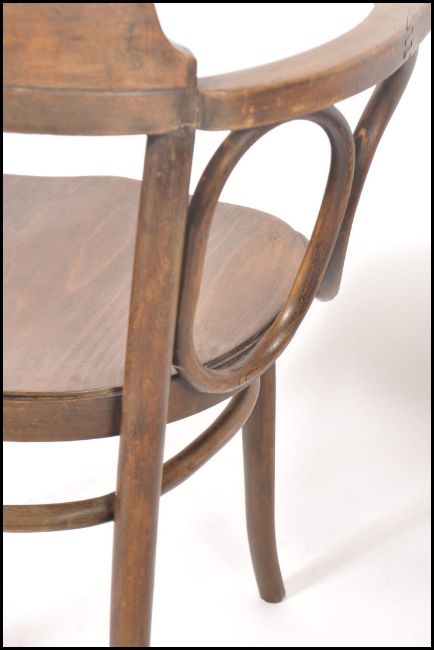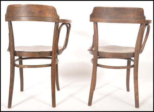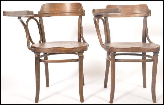 A pair of early 20th century Thonet bentwood cafe - students lecture chairs. Each with turned legs and bentwood back rests, one elbow support for books. Measures 84cm x 70cm x 54cm.