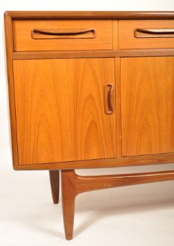 G-Plan - Fresco - A 1970's teak wood sideboard raised on shaped tapering legs having series of short drawers over cupboards beneath with recessed handles designed by Victor B. Wilkins. Measures 84cm x 52cm x 46cm.