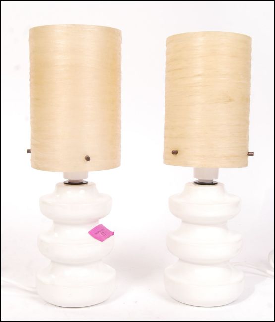 Sheerlite Doulton - A pair of mid 20th Century retro vintage glazed white ceramic lamps having acrylic spun lampshades, impressed marks to the base. Measures 31cm tall.