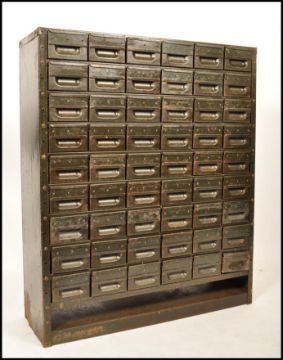N.C.Brown LTD - A 20th Century vintage industrial 54 drawer filling index cabinet in military green having a wide opening at the bottom and remains makers name to top. Measures 107cm x 90cm x 30cm.