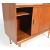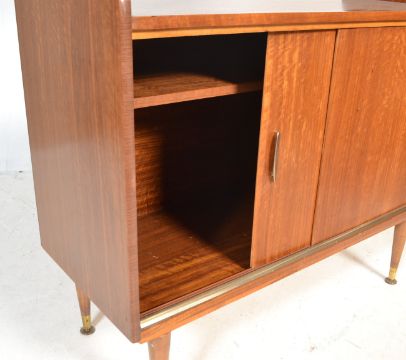A vintage retro 1960 teak wood room divider, double sided glass sliding doors below  the fixed shelves over two sliding doors on tapering legs, the unit being surmounted with a brass gallery top.