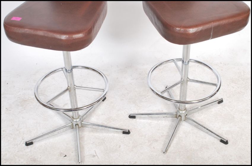 A pair of 20th Century bar stools having a chromed stand and quadruped base with footrest supporting a padded burgundy faux leather seat and short backrest. Measures 93cm x 52cm x 52cm.