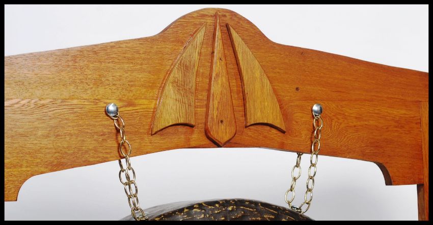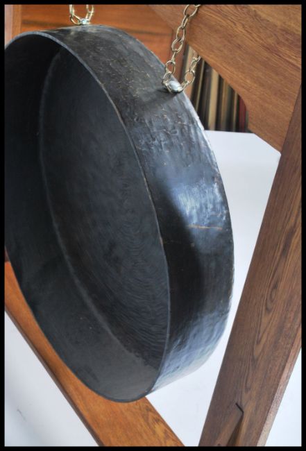 A good, large believed 19th century bronze / brass Chinese gong of cylindrical form resonating very well and being set to a later 20th century arts and crafts revival stand. Measures 123cm x 115cm.