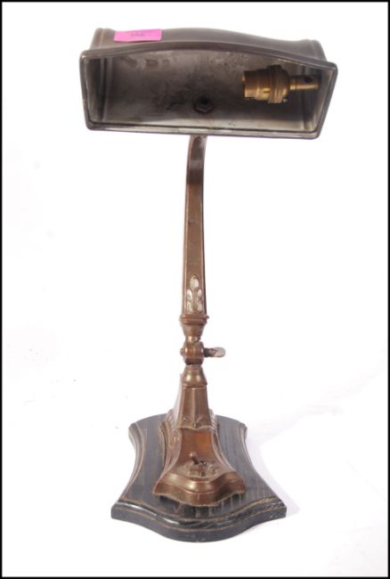 A 1930's Art Deco bronzed brass desk lamp having shaped arm with cylindrical wide pendant shade. All set over a wooden plinth base. Measures 42cm tall.