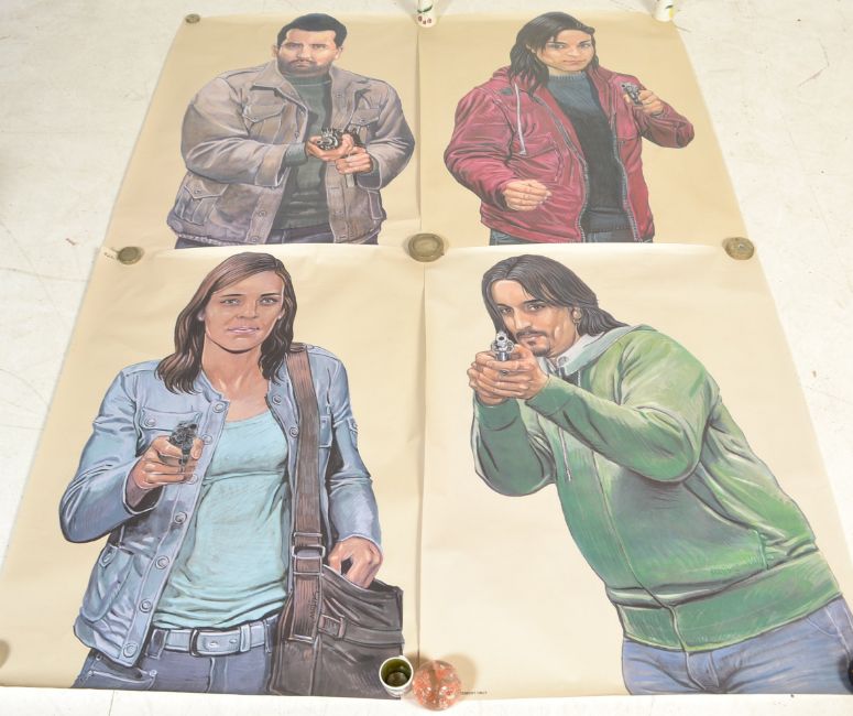 PJL Targets - Malik - Massoz printed - A set of 4x contemporary vintage style Belgium / Flemish police firing range shooting posters of criminals in various poses with weapons. Print to bottom ' For Law Enforcement Only ' .