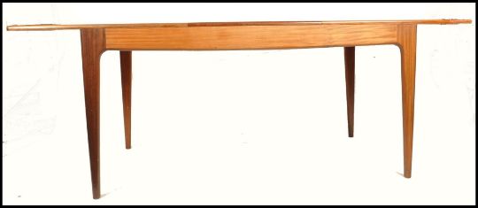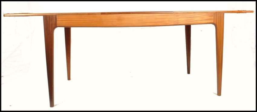 Youngers - A 1970's retro vintage teak wood extending table having the overlapping leg join and tapering with the fold out leaf and clip function. Measures 73cm x 142cm (198cm) x 79cm.