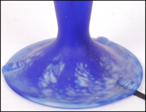 After Emile Galle - An Art Nouveau style glass desk / table lamps in a matt navy blue and dark blue colourway having a tulip and waisted stem with brass shaped arms for the domed shade to sit upon. Measures 47cm tall.
