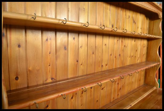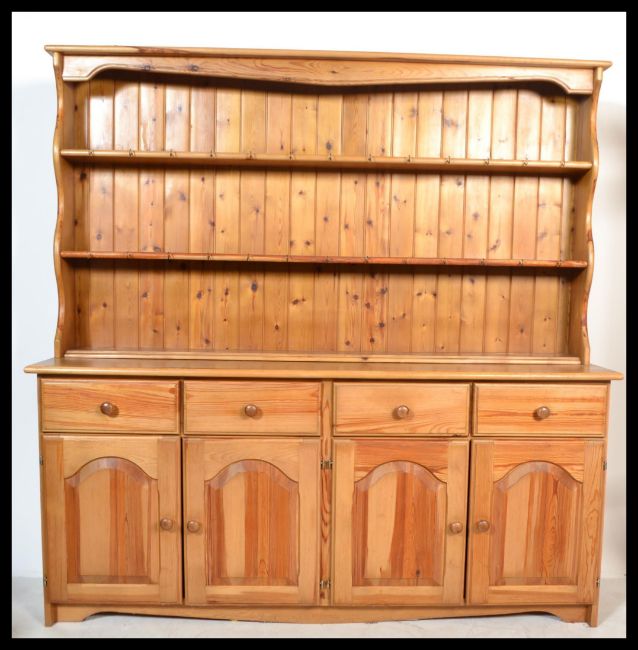 A 20th century country pine antique style dresser having cupboards and drawers to the base with a plate rack set to the top. Dismantles into 2 pieces for ease of movement