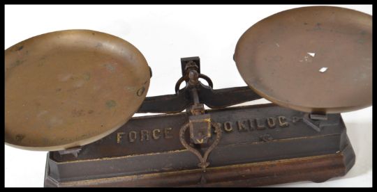 A set of three vintage early 20th Century pan scales, set to heavy cast bases.
