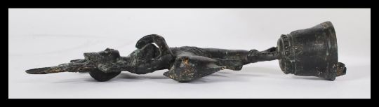 An ear;y 20th century bronze figurine bell of a dancing Buddha having large crown raised on a pedestal bell base.