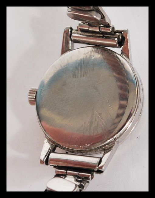 A vintage 1960s Omega wrist watch having a silvered dial with baton numerals and faceted hands. Omega winder present and set to an expanding watch bracelet.