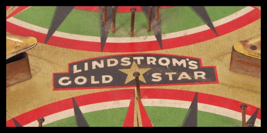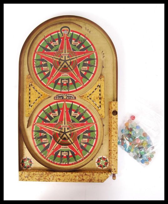 A 1930's vintage Lindstrom's Gold Star bagatelle board having a scrumbled finish and star motifs to the board to include a small collection of 20th century marbles.