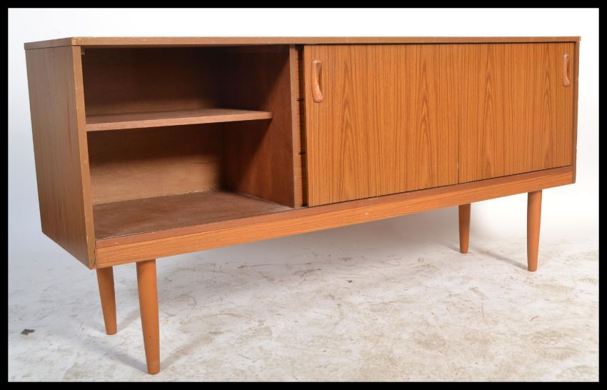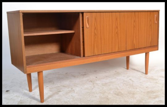 A retro 20th Century teak effect sideboard having a central bank of three drawers flanked by sliding doors raised on tapering turned supports, with applied makers label for Schreiber. Measures: 73cm high x 152cm wide x 41cm deep.