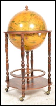 An antique style cocktail drinks globe having with applied terrestrial design with flip top lid and fitted interior  All supported on four turned column uprights and central ring turned column, raised on a cross base
