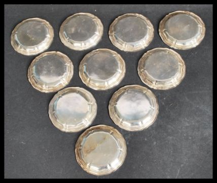 A matching set of ten continental silver peanut dishes / pin trays of scalloped form each being stamped 800. Total weight 140.3 grams. Measures 7 cm diameter.