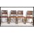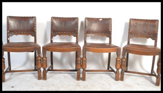 A set of four 20th Century Art Deco dining chairs, tan leather upholstered seat pads and back rests with stud detail raised on turned supports united by stretchers. Measures 83cms by 47cms by 42cms.