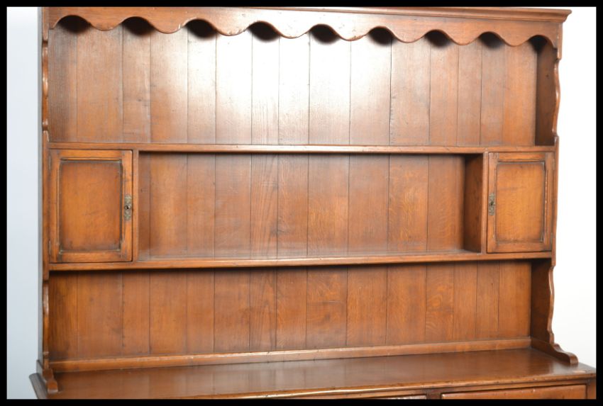 A Brights of Nettlebed 17th Century style oak dresser  having fitted short drawers, each with mahogany crossbanding being raised on six turned supports united by a pot board to the base. Above a stunning upright gallery back plate rack with flared cornice atop. Matching table and chairs, plus carvers available in lots 1422 & 1244 Measures 197cms high by 183cms wide by 45cms deep.