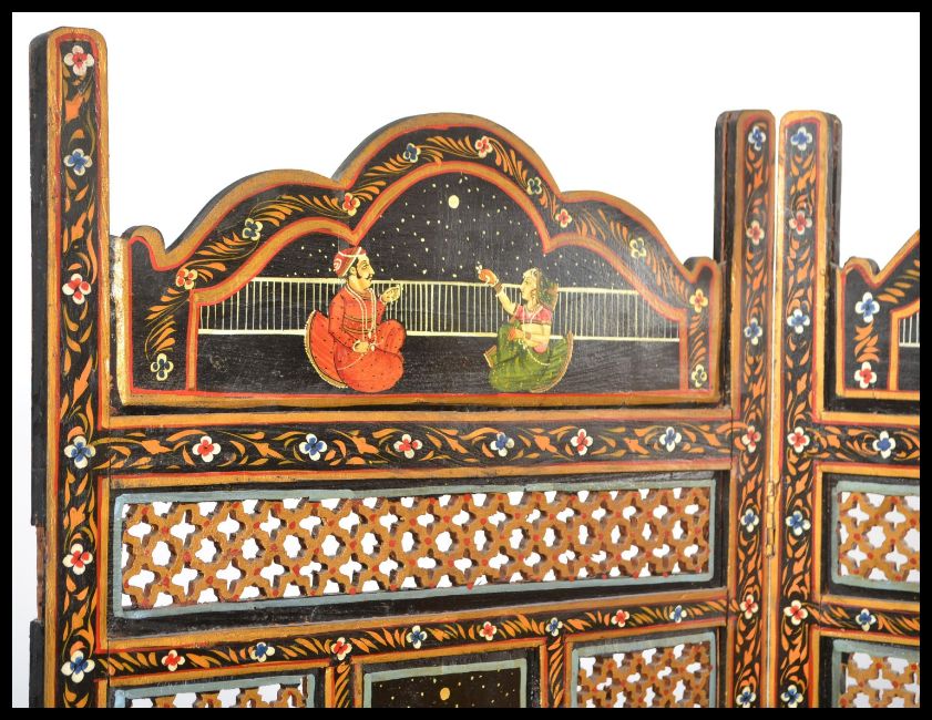A 20th Century Indonesian lacquered two - fold folding discretion screen, mesh / fret work panels together with painted panels of domestic scenes.