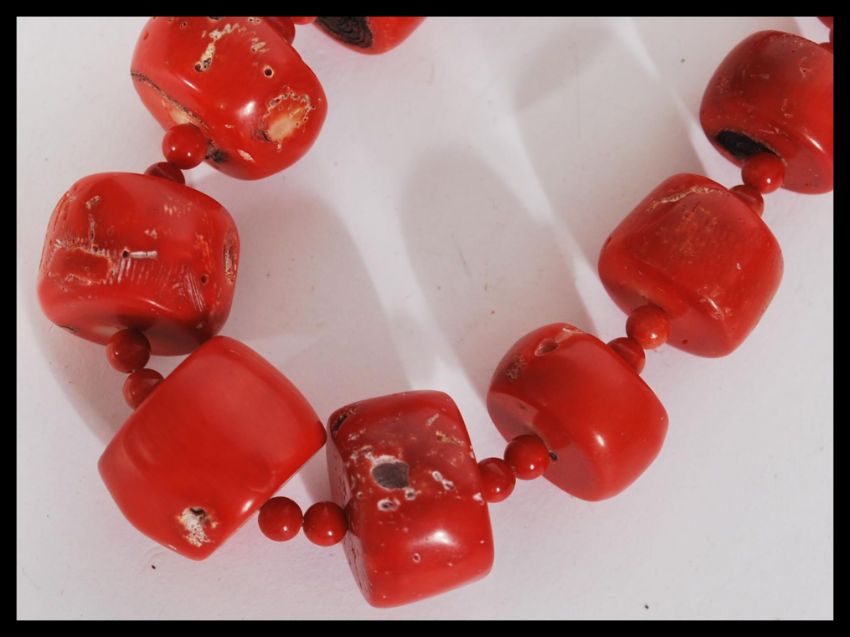 A large coral necklace having varying baroque coral beads with silver white metal hook clasp.