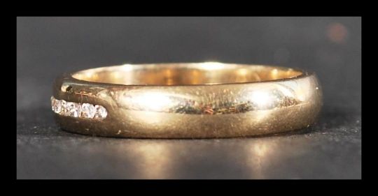 A hallmarked 9ct gold and diamond band ring having 9 suspension set diamonds. Hallmarked Birmingham. Weight 3.9g. Size O