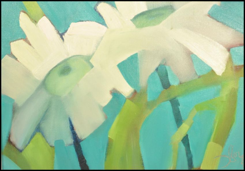 Dick Boulton ( Artist & Sculptor ) - A 20th Century abstract oil on board, painting of a pair of two white flowers, signed to the corner and being framed. Measures 45cm x 60cm.