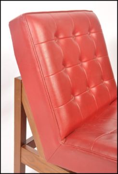A 1970's retro vintage easy lounge chair / armchair comprising of a button backed crimson red vinyl seat cushion and back cushion raised on angular squared legs. the armchair being in the manner of Ole Gjerløv-Knudsen / Torbin Lind for France & Søn. Measures 78cm x 52cm x 72cm.