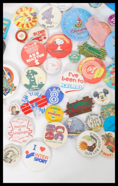 An assorted collection of badges and pencil erasers badges to include are Dart Valley Railway, Ever Ready, Mr men and many more.