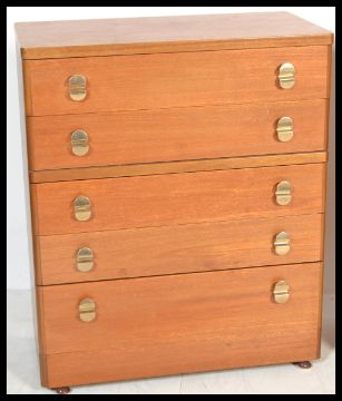 Stag Furniture - A pair of vintage retro 20th century chests of drawers in the Cantata range having a configuration of two over three drawers with split brass handles. Measures 98 cm x 82 cm x 44 cm.