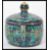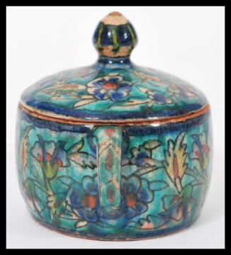 An unusual 20th century Middle Eastern studio pottery lidded pot having twin hoop handles and finial lid. Hand painted with floral sprays. Unsigned. Measures 13cms wide.