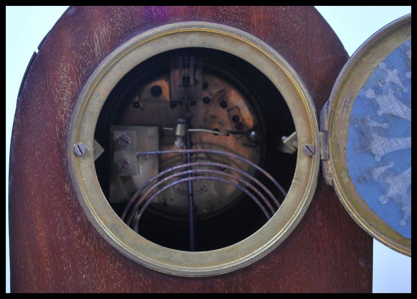 An Edwardian mahogany inlaid spire shaped mantel clock with 8 day brass clock movement, enamel dial with roman numeral chapter ring and notation for Bracher & Sydenham of Reading.