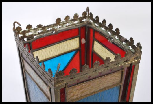 An early 20th century Arts & Crafts stained leaded glass porch lantern of square form having coloured triangular panels. Please see images.
