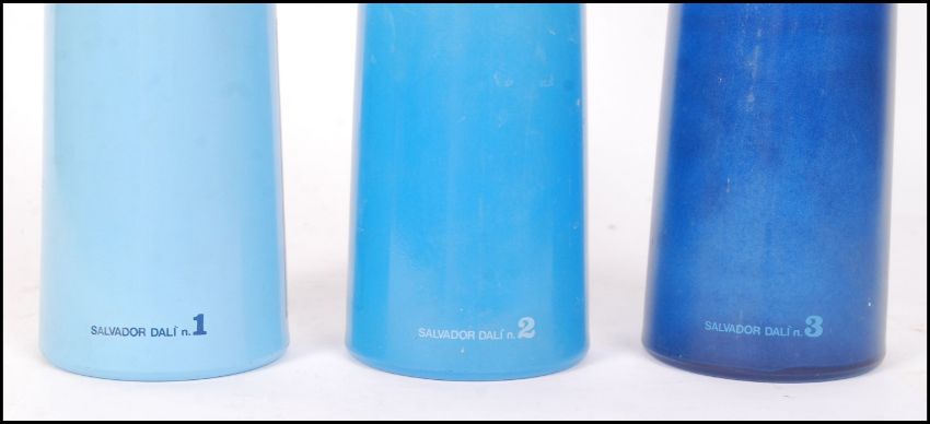 Salvador Dali - A set of three retro circa 1970 / 71  Rosso Antico glass bottles with the Spanish surrealists screen printed designs, each with a facsimile Dali signature. Measures 32cm high