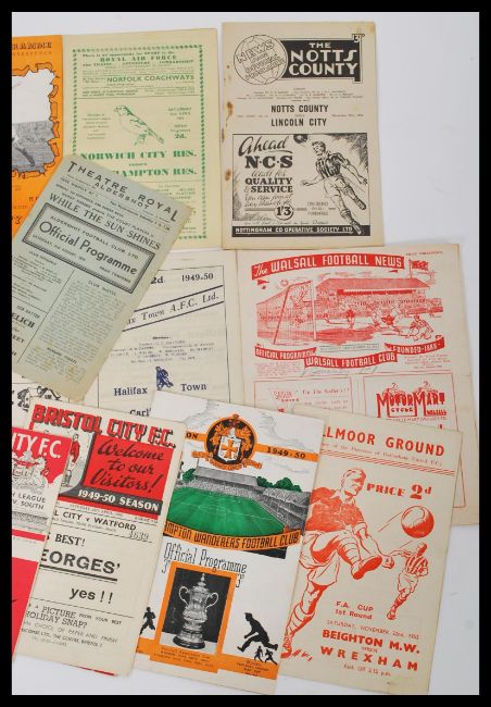 A collection of vintage 20th Century football programmes dating from the 1940's to include Swansea Town v Newport County 1946, Southampton v Newport County FA Cup Third round 1946, Torquay v Plymouth Argyle 1951, Bristol City v Torquay, Bristol City v Charlton Athletic, Bristol City v Reading, Bristol City v Watford, Watford v Bristol City, Brighton M.W. v Wrexham 1952, Wolverhampton Wanderers v Manchester United 1950, West Ham United v Blackburn Rovers, Walsall v Coventry 1952, Aldershot v Bristol City Halifax Town AFC v Carlise United 1950, Grimsby Town v QPR 1951, West Bromwich Albion v Middlesbrough 1950, Lincoln City v Birmingham, Luton Town v Leeds United 1951, Northampton Town v Shewsbury Town, Notts County v Lincoln City 1952, Norwich City Res v Northampton Res 1951, Hull City v Bury 1951, Plymouth Argyle v Lincoln City 1952, Gillingham v Reading 1952 and Oldham Athletic v Rotherham United 1953.