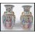 A near pair of Oriental Chinese ceramic vases one being an 18th century example with famille rose medallions and cartouche panels depicting traditional scenes having gilt Fu dog handles. Ochre red character marks to base. The other being a later 19th century example of the same vases.