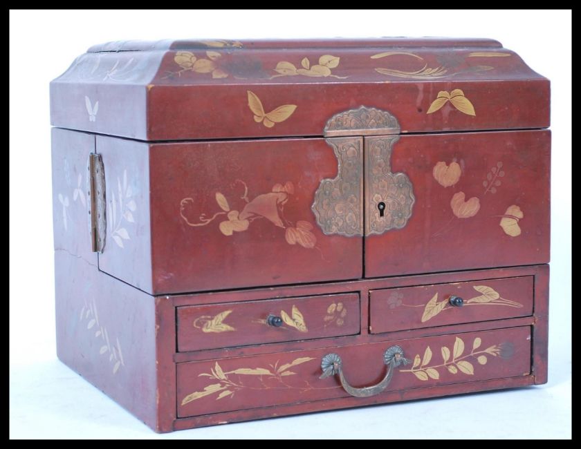 A 1930's Japanese chinoserie and lacquered ladies jewellery box. The red body with gilded decoration having articulated doors reveal inner drawers. Measures 23 cm high, 26.5 cm wide and 22 cm deep.