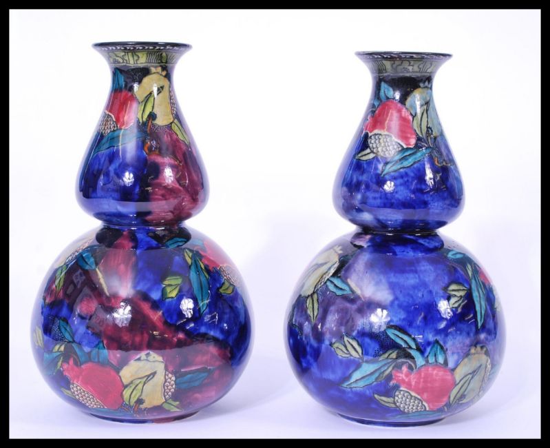 A pair of vintage gourd vases by Rubens ware shape 6767. Globular bodies with deep blue ground with decoration of pomegranate.