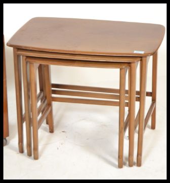 A 1970's teak wood Danish influence trolley by Remploy having twin tiers, angular frame with castors together with a nest of tables. Measures 52 cm x 82 cm x 43 cm.