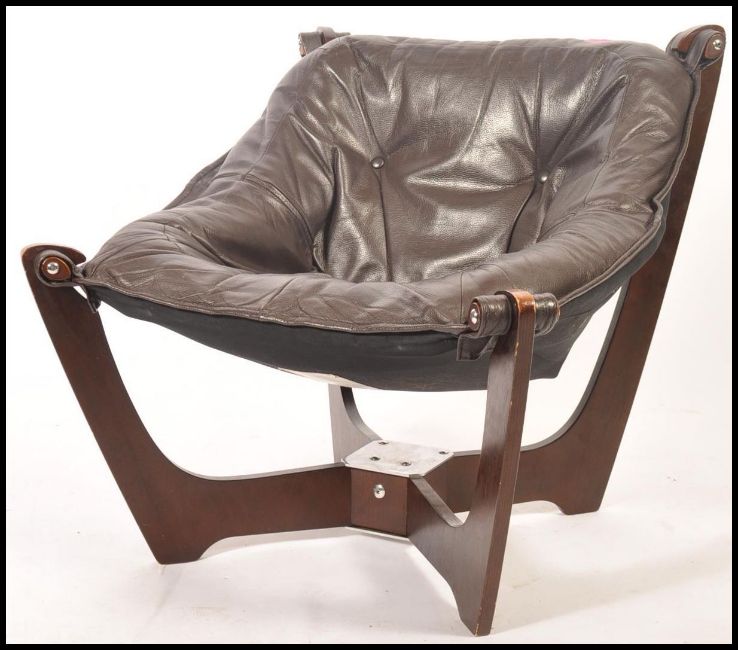 Odd Knutsen - Luna chair - A retro style bucket chair / tub / sling armchair comprising of a faux Havana brown leather cushioned hammock seat raised by a layered walnut plywood frame joined with a metal plate to center. Design bought by John Lewis and named the Zest chair, which is now a retired line. The chair having fire regulation labels to underside. Measures 72cm x 74cm x 78cm.