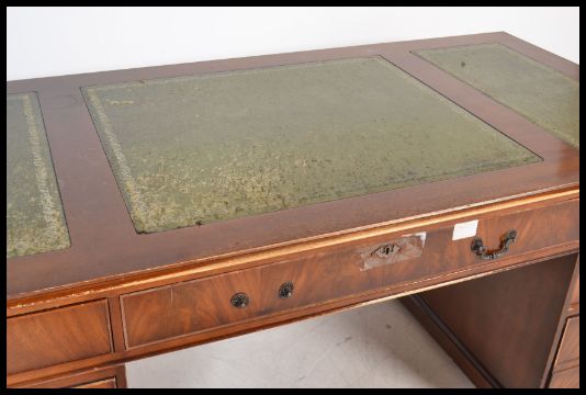 A Georgian style large mahogany and leather twin pedestal desk. Each pedestal with a bank of drawer having swing handles and plinth bases. Atop a 3 section tooled leather writing skiver