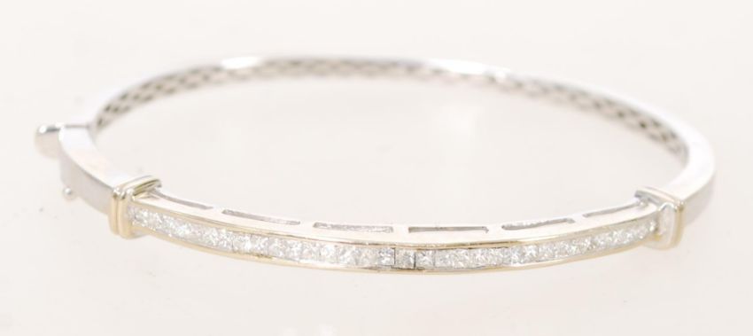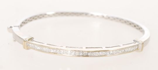 An 18ct white gold bangle bracelet with channel inset diamonds and a hidden clasp.