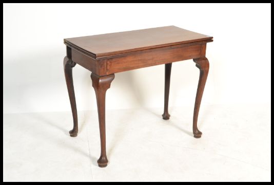 An 18th century George III solid cuban mahogany tea table / games table raised on cabriole legs with pad feet having fitted frieze with fold over table top above. Measures 74 cm x 88 cm x 44 cm.