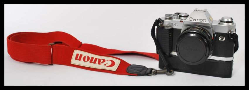 A vintage 1983 Canon AL-1 SLR Camera complete with authentic Canon neck strap, power winder and FD 50mm f1.8 kit lens + original Canon lens cap. Overall good used cosmetic condition but in need of minor repairs for light seals and film door.