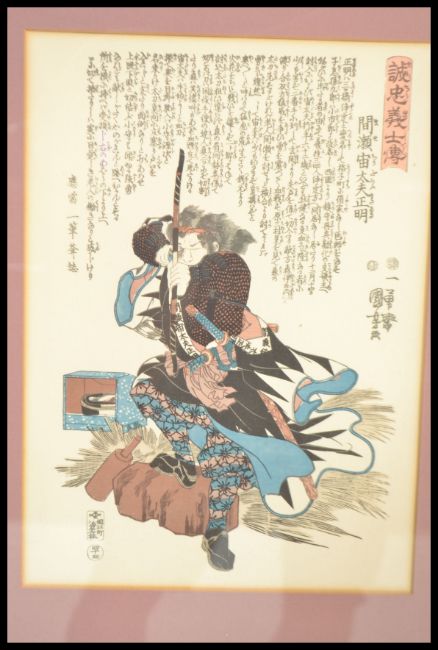 A large framed and glazed set of 6 Samurai Warrior Ronin's with Chinese text, possibly woodblock prints mounted and set to a frame.  Measures 84cms high x 94 cms wide