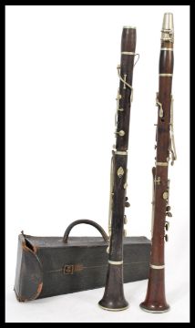 A pair of Rosewood ' A ' & ' B ' rosewood clarinets dating from the early part of the 20th century having white metal keys and shared mouthpiece by EJ Albert of Brussells. Highest measures 65.5 cm.