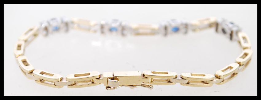 A contemporary box chain ladies bracelet with 4 sapphire and diamond spacers in prong settings and clasp.