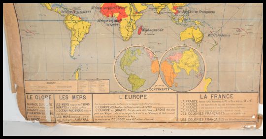 A large vintage early 20th century French map of the globe and Europe with the French Colonies highlighted in red. Map by Dufrenos of Paris. Measures: 98cm high x 117cm wide.