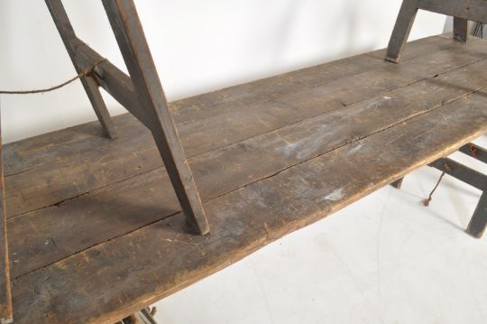 A pair of vintage retro 20th century trestle table tops raised on two sets of folding trestle  table legs. Each piece having matching lettering.