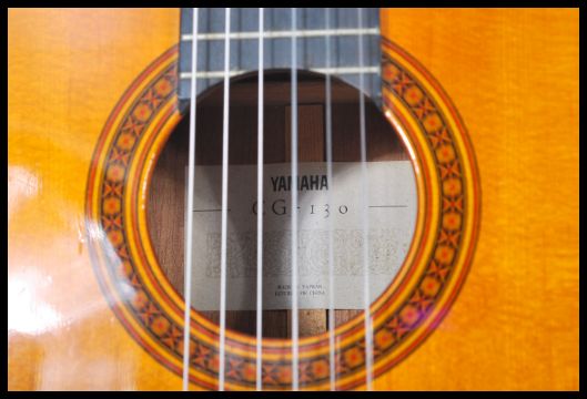 A vintage Yamaha six string acoustic guitar model CG 130 having a shaped hollow body with mother of pearl tuning pegs. Paper label to interior.
